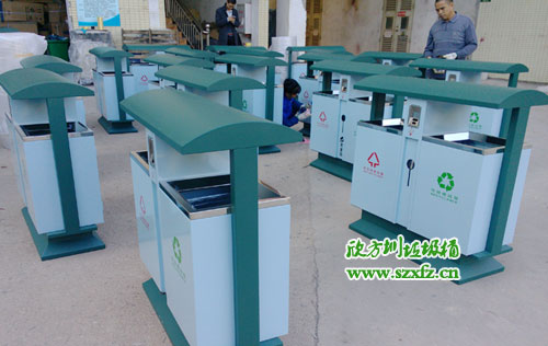 深圳龍崗區(qū)街道辦采購(gòu)F95戶(hù)外鋼板分類(lèi)垃圾桶,按照15天交貨日期,如期完工,送貨上門(mén)。此款F95戶(hù)外鋼板分類(lèi)垃圾桶規(guī)格為:1000*400*1000.鋼制垃圾桶屋檐桶頭設(shè)計(jì),防止雨水傾入內(nèi)桶。煙頭投口,分類(lèi)垃圾,隔絕火患。有害投口,充分利用空間。桶兩邊都絲印有,標(biāo)志,字體,不可回收字樣,采用紅顏色。 標(biāo)志,字體,可回收字樣,采用綠顏色。巧妙的設(shè)計(jì),結(jié)合城市人性化,更好服務(wù)城市居民。
