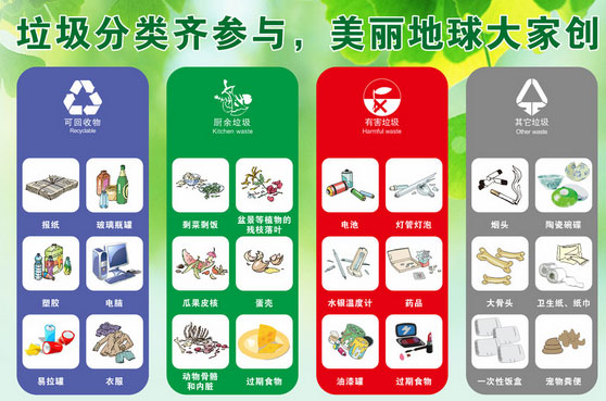 (5)布料:主要包括廢棄衣服、桌布、毛巾、布包等 如每回收1噸廢紙可造好紙850公斤,節(jié)省木材300公斤,比等量生產(chǎn)減少污染74%;每回收1噸塑料飲料瓶可獲得0.7噸二級(jí)原料;每回收1噸廢鋼鐵可煉好鋼0.9噸,比用礦石冶煉節(jié)約成本47%,減少空氣污染75%,減少97%的水污染和固體廢物。 可回收物以外的垃圾基本上都是廢棄物。比如煙頭、雞毛、廢電、煤渣、建筑垃圾、油漆顏料、食品殘留物等等。 有毒垃圾,包括廢電池、日光燈管、水銀溫度計(jì)、油漆筒、藥品、化妝品等。 垃圾是放錯(cuò)了地方的財(cái)富。
