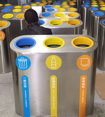 室內(nèi)斜面投口地鐵不銹鋼三分類垃圾桶批量生產(chǎn)圖